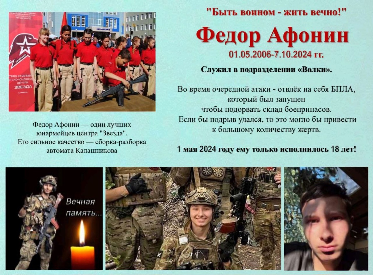 Быть воином - жить вечно! В этом году Россия отмечает 80-ю годовщину окончания Великой Отечественной войны. Подвиги прошедших лет увековечены в монументах, памятниках, которые установлены не только в разных частях нашей страны, но и за ее пределами. К сожалению, текущий год омрачен продолжением боевых действий у границ нашего государства. Идет специальная военная операция, призванная решить локальные военно-политические задачи малыми силами профессиональных специальных подразделений. Так официально называют борьбу добра со злом. Как и в дни Великой Отечественной войны, наши соотечественники воюют за правое дело. 2024 год был омрачен для меня и моей семьи: трагически погиб, в бою спасая своих товарищей, мой троюродный брат Федор Афонин, ему было всего 18 лет! Он погиб героем, похоронен на аллее Славы в городе Рязани. К сожалению, я не так часто общалась со своим братом, но много знаю о нем, его увлечениях и характере, от своей мамы. Федор с детских лет был требователен к себе, собран