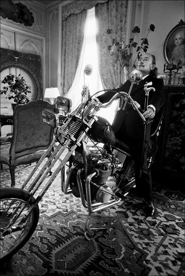 Испанский художник Сальвадор Дали (родился 11 мая 1904 года) на чоппере Honda CB750 в отеле Le Meurice в Париже. Там он долгое время снимал весь этаж для своей мастерской и, говорят, очень любил курсировать по этажу на мотоцикле.