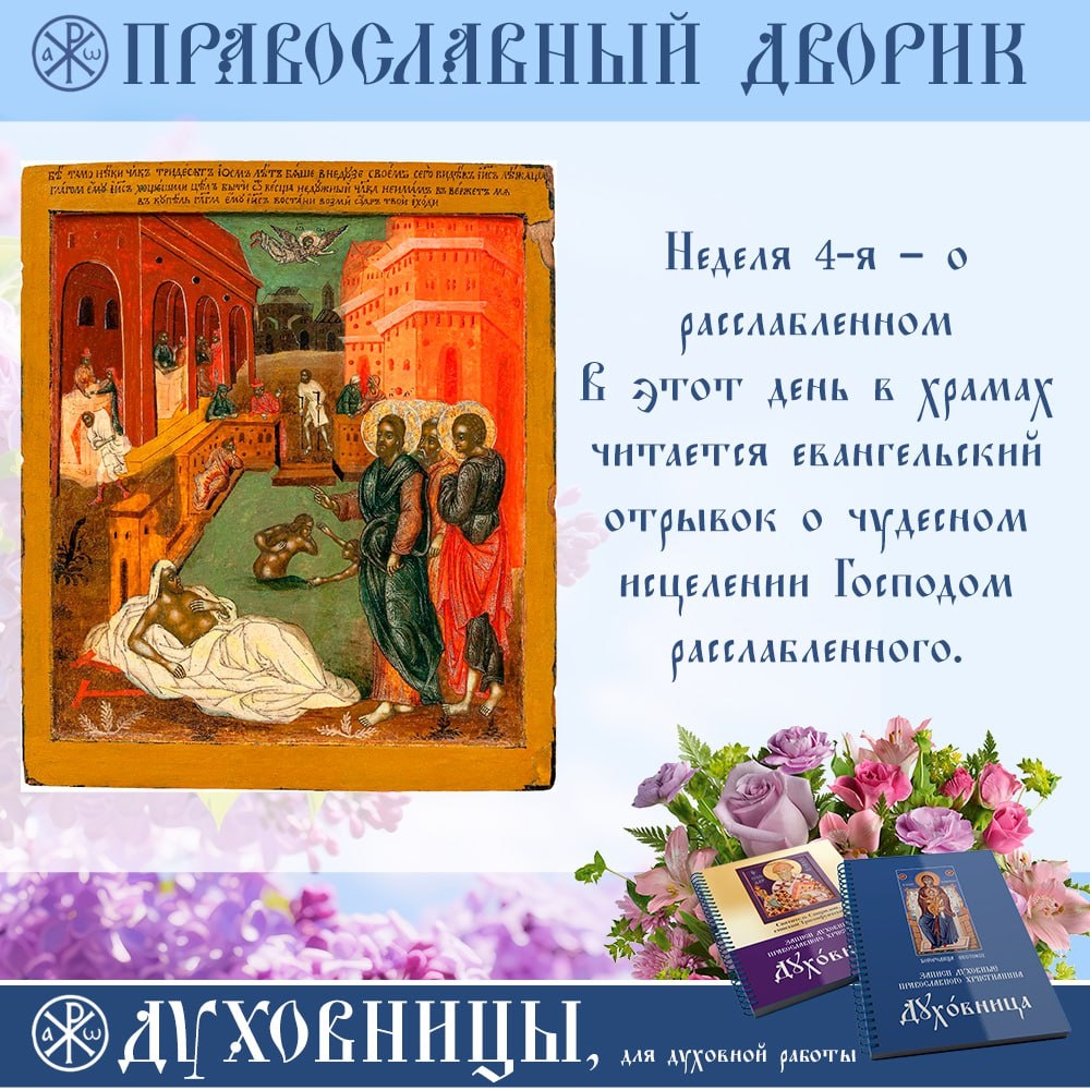 😌еделя 4-я – о расслабленном В этот день в храмах читается евангельский отрывок о чудесном исцелении Господом расслабленного. Он был в недуге 38 лет и ждал избавления от него около купальни, в которой раз в году исцелялся первый в нее входивший (Ин. 5:1–14). ☺️та купальня была прообразом дарованной Христом купели Крещения, в которой уже не раз в году, а в любой час каждый уверовавший может исцелиться, очистив себя от скверны греховной, и родиться для новой жизни. Пять крытых ходов, ведущих к купальне, символизируют пять Книг Моисеевых, ведущих ко спасению, то есть иудейское Писание, которое, по слову Самого Спасителя, свидетельствует о Нем (Ин.5:39). Соответственно, множество больных, лежавших вокруг купальни, являют образ пораженного грехом падшего человечества, ожидавшего пришествия Мессии и спасения. 😚вангелие о расслабленном иносказательно повествует нам о болезни расслабления духовного. Таковое расслабление обыкновенно наступает от отчаяния или лености и уныния, но важно помни