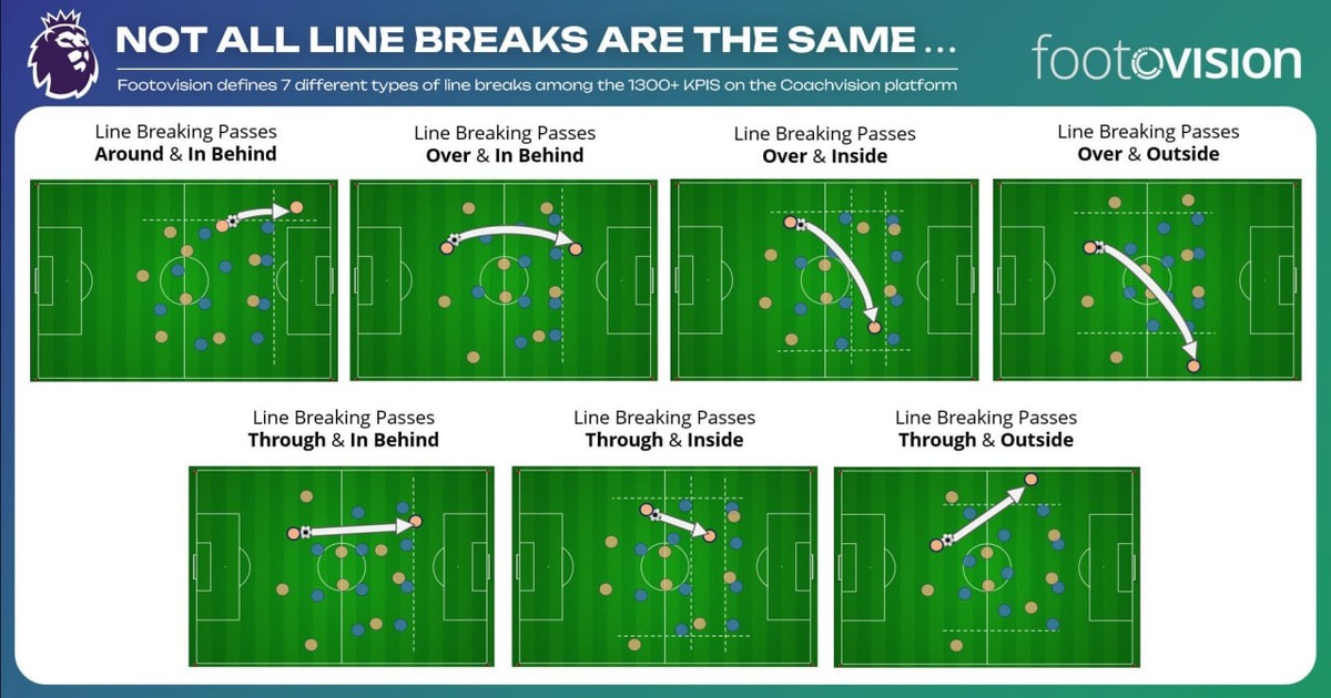 Резать линии обороны можно по-разному На инфографике показано, какие именно типы разрезающих передач (line-breaking passes) используют команды АПЛ и в каких зонах поля происходит такой пас. — между игроками — поверх них (Фернандес vibe) — по флангу или через центр — вглубь или “за спину” Существует 7️⃣ типов разрезающих передач: 1. Around & In Behind Пас идёт в обход обороны по флангу, за спины защитников 2. Over & In Behind Средний/длинный пас в зону за спинами Мяч летит над игроками соперника, обычно с центральной зоны — на рывок нападающему 3. Over & Inside Длинный пас сквозь центр поля Опять же — над линией обороны, но в центральную зону, часто между центральными защитниками 4. Over & Outside Длинный пас на фланг, поверх крайних защитников Мяч проходит над защитой и ближе к флангу — на вингера или подключившегося фулбэка 5. Through & In Behind Пас низом между игроками обороны, за спины защитников Типичный пас вразрез — через линию обороны, но по земле 6. Through & Inside Па