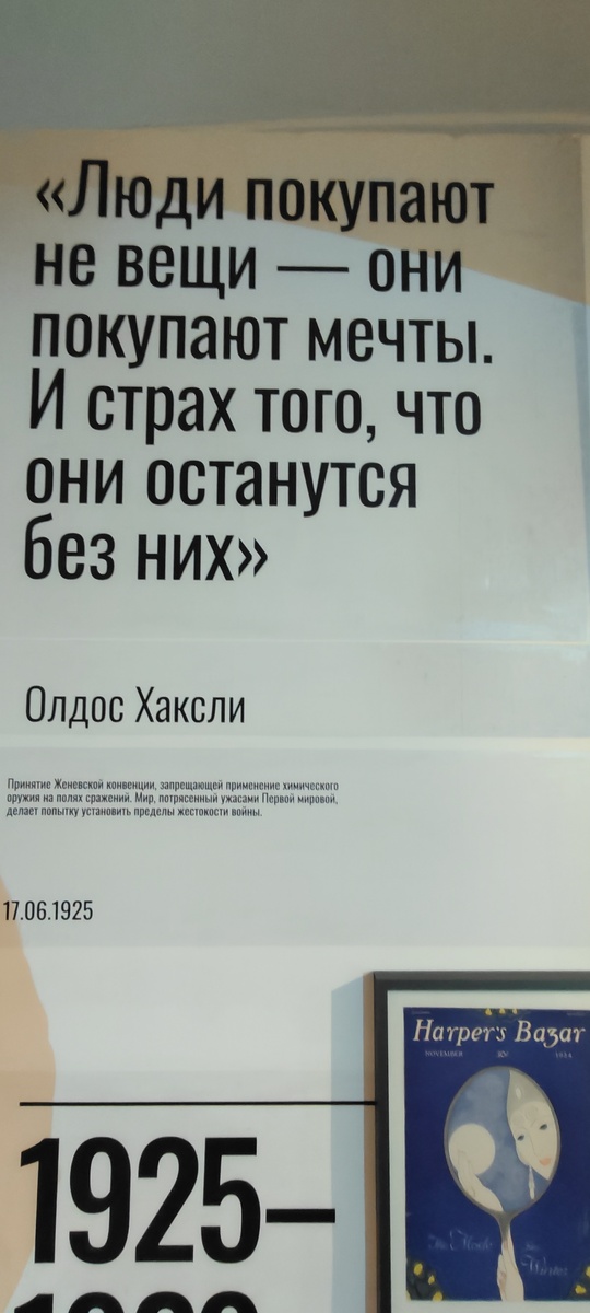 Прекрасно организованная в манеже Малого Эрмитажа выставка, посвящённая эпохе между Мировыми войнами. Помимо выставленных оригинальных предметов на стендах много интересной информации о моде, политике, изобретениях, технологиях периода 1918-1939. Радикальные изменения в общественной жизни после Первой мировой войны привели не только к появлению новых социальных явлений, но и к переосмыслению привычных понятий. Так, например, загар, считавшийся признаком принадлежности к низшим классам, в силу необходимости вынужденным работать на открытом воздухе, в 1920-е годы входит в моду как показатель достатка и свободного времени. Развивается культура пляжного отдыха, появляются оборудованные пляжи с кабинками, лежаками и кафе. Многие прибрежные города перепрофилируется в курорты, куда приезжают не только лечиться, но и просто отдыхать. Купальная мода рубежа XIX-XX веков скорее отвечала требованиям приличия, чем удобства. Время викторианских купальных машин прошло, но открывать тело полностью вс