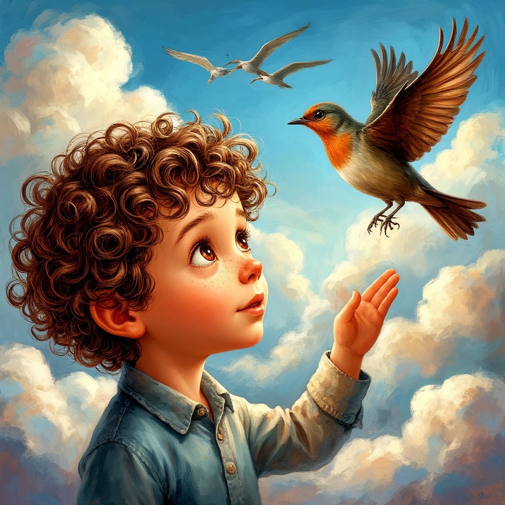 Луми жил в облачном мире уже несколько дней. Он подружился с Птицей Облачницей, помогал строить мосты из пушистых облаков, слушал шёпот небесных историй и узнавал много нового. Но этим утром он проснулся с ощущением, что пора снова в путь. Пока он умывался капельками росы и завязывал свой рюкзак, Облачница подлетела ближе. — Ты чувствуешь, что пора, да? — тихо спросила она. Луми кивнул. — Здесь так хорошо, и я многому научился. Но сердце подсказывает — пора идти дальше. Может быть, где-то меня ждут новые приключения. — Тогда я покажу тебе одно особенное место, прежде чем ты уйдёшь, — сказала Облачница. Они взлетели ввысь, где облака становились особенно лёгкими, почти прозрачными. Здесь всё было тихо, но если прислушаться, можно было услышать шёпот. — Это шепчущие облака, — объяснила Облачница. — Они хранят мечты и добрые слова со всего мира. Иногда сюда попадают даже забытые желания. Луми замер и стал слушать. «Хочу обнять друга...» «Хочу, чтобы мама всегда улыбалась...» «Хочу быть с