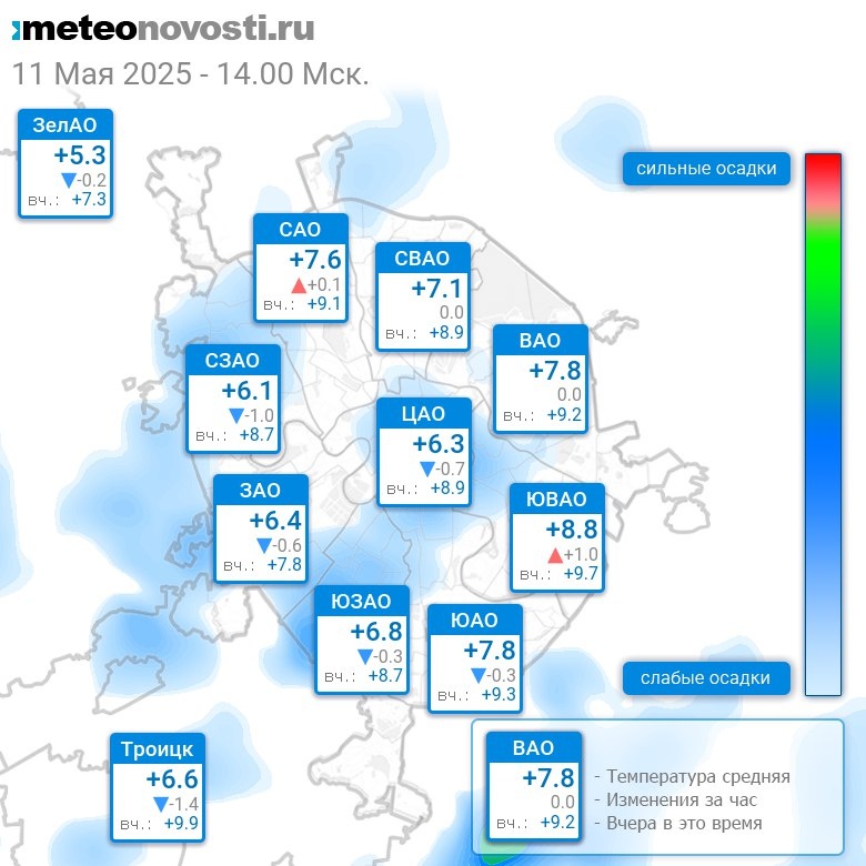 В 14:00 в Москве было от +4.5°C до +9.8°C, средняя температура +7.1°C #погода #Москва #весна #температура #11мая #воскресенье