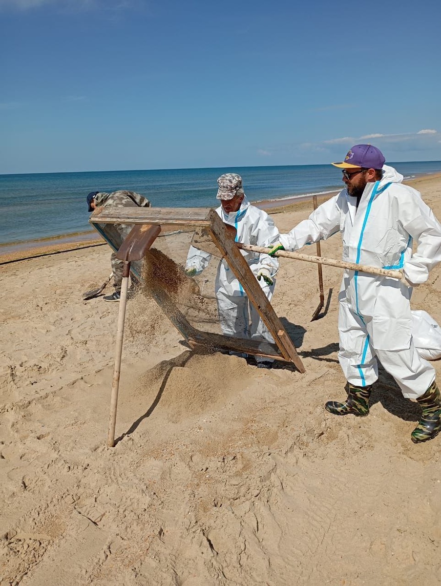 11 мая на побережье Анапы новых выбросов мазута не зафиксировано По результатам утреннего обследования прибрежной зоны, которое провели команды городов и районов Краснодарского края, следов свежего загрязнения нефтепродуктами нет. На видео – состояние пляжа на участке между с. Витязево и ст. Благовещенской, уборкой которого занимается команда Красноармейского района. На первом и втором фото представители Павловского и Славянского районов производят деликатную очистку песка. Одна группа трудится на пляже «Витязь» в с. Витязево, другая – на береговой линии у дома отдыха «Фея-2» в п. Джемете.