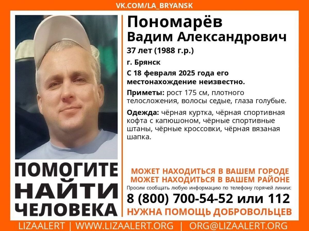 37-летний Вадим Пономарев из города Брянска пропал без вести. Волонтёры предполагают, что мужчина может находится на территории Воронежской области. Ориентировку распространили в поисковом отряде "ЛизаАлерт". Местонахождение Вадима неизвестно с 18 февраля текущего года. Рост мужчины составляет 175 сантиметров. У него седые волосы, голубые глаза и плотное телосложение. Вадим был одет в чёрную куртку, чёрную спортивную кофту с капюшоном, чёрные спортивные штаны,такого же цвета кроссовки и вязаную шапку. Если вам известно возможное местонахождение Вадима Пономарева, просьба сообщить об этом полиции по номеру 112, или позвонить волонтёрам по номеру, указанному на ориентировке. Вчера волонтёры поискового отряда "ЛизаАлерт" сообщили о пропаже 23-летнего Гора Абрамяна. Молодой человек пропал в Воронеже 23 апреля. Ему может понадобится медицинская помощь.