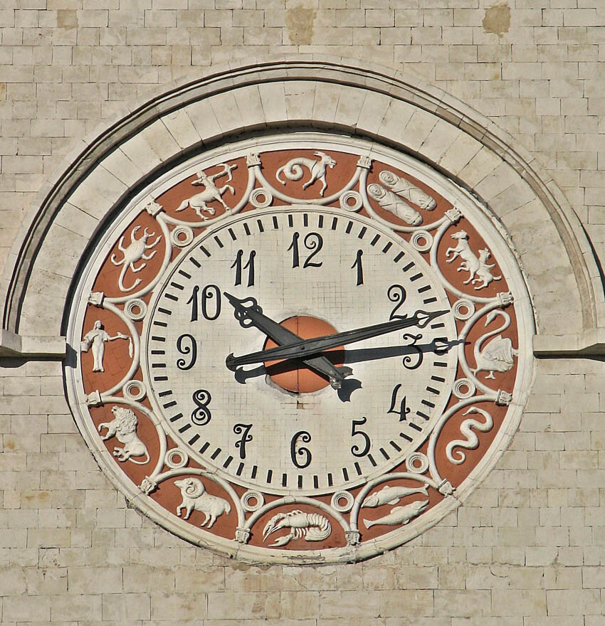 Обычно, когда говорят о достопримечательностях вокзала, упоминают, что на башне есть часы с изображениями знаков зодиака. Но никто не говорит, что симферопольский зодиак не такой, как все остальные. На самом деле, он отличается и его знаки зодиака немного другие. Козерог находится между "12" и "1" — там, где и должен быть. Остальные знаки тоже на своих местах. Но мало кто знает, что это сделано специально, чтобы никто не заметил подвох. На самом деле, в круге созвездий всё перепутано, и среди обычных 12 знаков нет Тельца, Девы и Весов. Вместо них — Гончие Псы, Лебедь и Змееносец. Это не ошибка строителей, как думали местные краеведы в советское время. Каждый из этих знаков — огромный, дорогой барельеф, сделанный лучшими мастерами СССР по специальным эскизам. Чтобы понять, в чём дело, нужно немного узнать историю. Часы с похожим "не таким" зодиакальным кругом также стоят в городе Сочи.На часах в Крыму изображен знак Скорпиона. В Сочи на ч