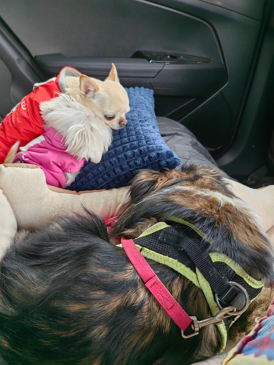Всю дорогу в Новгородской области мы проехали в снежно-дождевой массе. При подъезде к городу даже появилось солнце. Встала я в 6-30, спала иди нет, даже не поняла. Гера забралась между нами и периодически при шевелении вскрикивала или перебиралась ближе к нам на подушку. Пока собирались, она так и лежала. Не ела, воду и лекарство залила ей в рот. Сделала укол и тихонько погрузили в машину, где она и пролежала всю дорогу, а я сидела рядом и контролировала. Мы везли еще тетю с ее мамой, поэтому мелкие ехали на руках и тоже спокойно спали. Зато Тигра не давала спокойно жить, она орала всю дорогу. Меняли ей пеленки останавливались, она сделала все, что только можно в переноске. Не любит Тигра ездить, а вот Нафанька мирно проспал эти часы и не пикнул. Подрулили сразу к клинике, сегодня там на приёме менее опытный врач, поэтому вытащили на всякий случай назначения те, что были ранее, она написала нам направление на МРТ. Я уже записалась на обследование двух зон, шейного и грудного отд