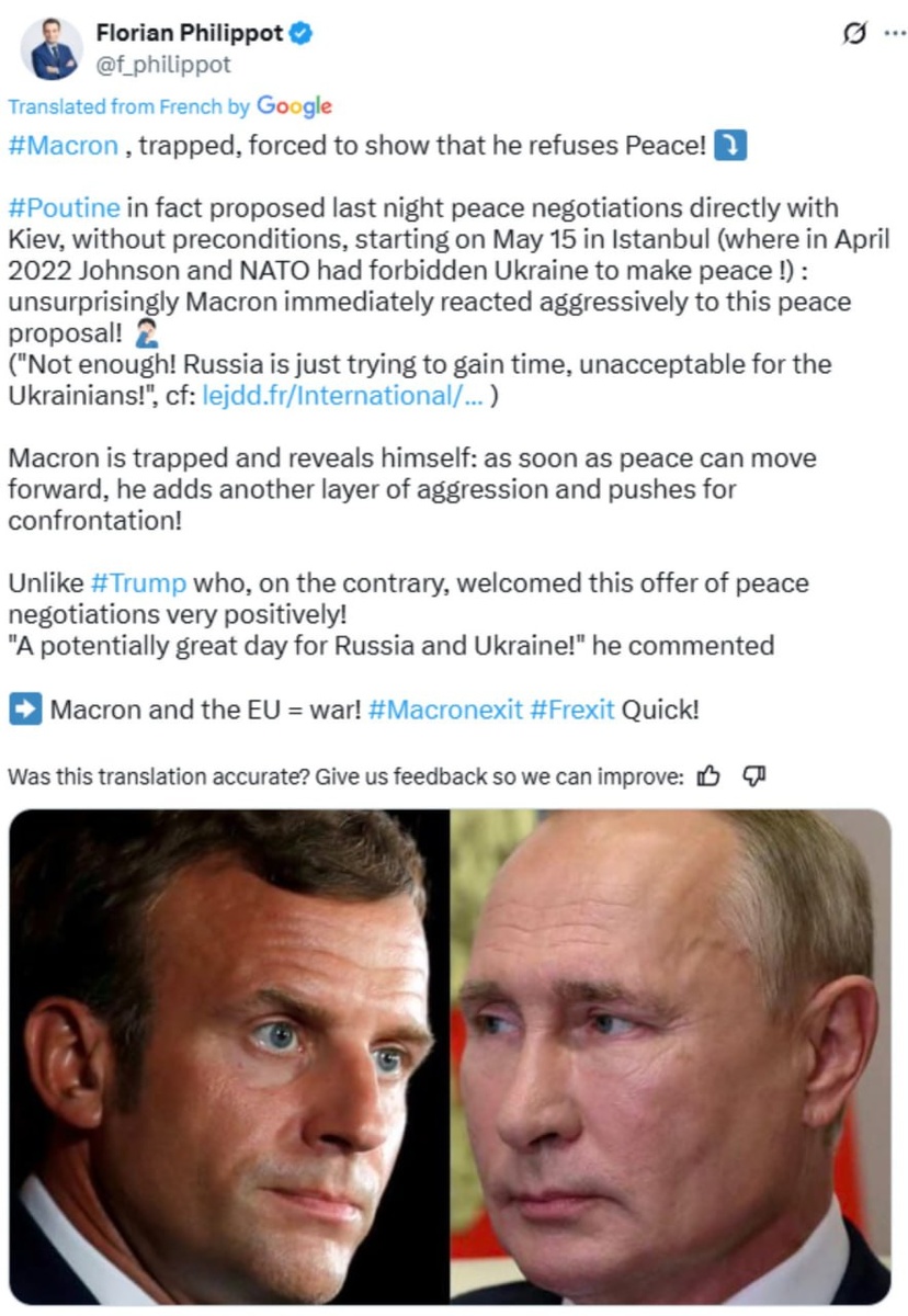 В ответ на пост France’s The Patriots Party chief BACKS Putin’s direct Ukraine talks offer Philippot pits Trump and Macron against each other: While Trump called it 'potentially great day', 'Macron and the EU = war!'. #Putin #France #Ukraine