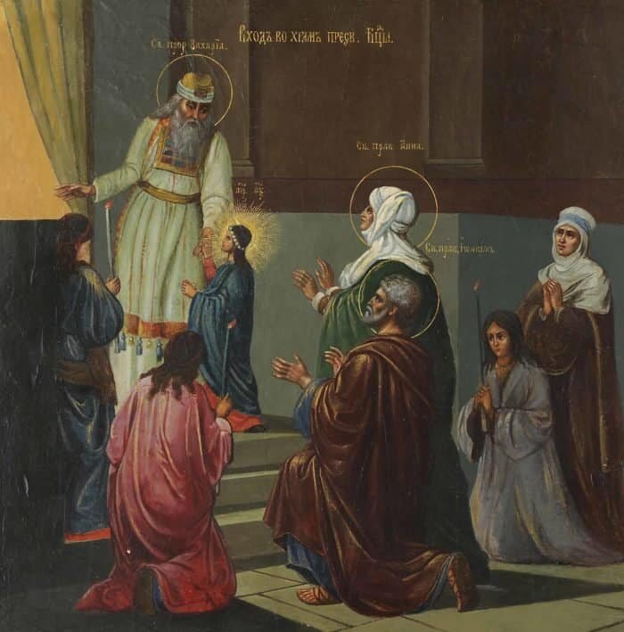 - Посвящение в храм в Иерусалиме: 3 года (ок. 17 г. до н.э) Когда Марии исполнилось три года, её родители, соблюдая обет, привели её в Иерусалимский храм для воспитания среди дев благочестивого сословия. Этот ранний ввод в храмовую школу был вестью о её особом призвании и символом полного посвящения Богу с самого детства