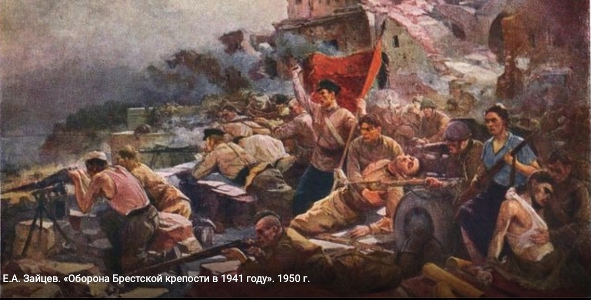 Таким памятником героям можно назвать картину Евгения Алексеевича Зайцева "Оборона Брестской крепости в 1941 году".