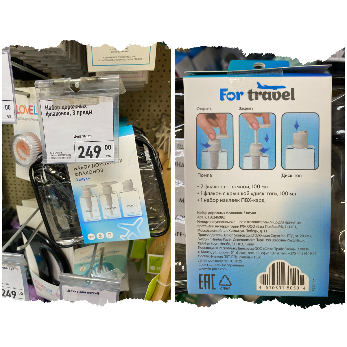 Всем привет. Меня зовут Наталья. Я очень рада видеть вас на своём канале. Сегодня мы с вами прогуляемся по магазину Фикс Прайс, который находится по адресу: город Йошкар-Ола, улица Йывана Кырли, дом 15б. В этот раз я опять покажу самые красивые новинки. Так что устраивайтесь поудобнее. Желаю всем приятного времяпровождения. Начну обзор с того, что может пригодится тем, кто планирует путешествие. Набор дорожных флаконов стоимостью 249 рублей. В упаковке 3 штуки: 2 флакона с помпой объёмом 100 мл каждый, 1 флакон с крышкой "диск-поп" объёмом 100 мл. Также в наборе есть наклейки ПВХ-кард и собственно косметичка, в которой всё лежит. Состав: флакон: ПЭТ, ПП; наклейки: ПВХ. Страна изготовления Китай. В магазине 2 варианта цвета. Водонепроницаемый чехол для телефона стоимостью 79 рублей. В комплекте есть шнурок длиной 40 см. Состав: ПВХ, полипропилен. Страна изготовления Китай. Данный чехол подходит для смартфонов длиной максимум 16 см. Степень его защиты: IPX8, что означает защиту от проник