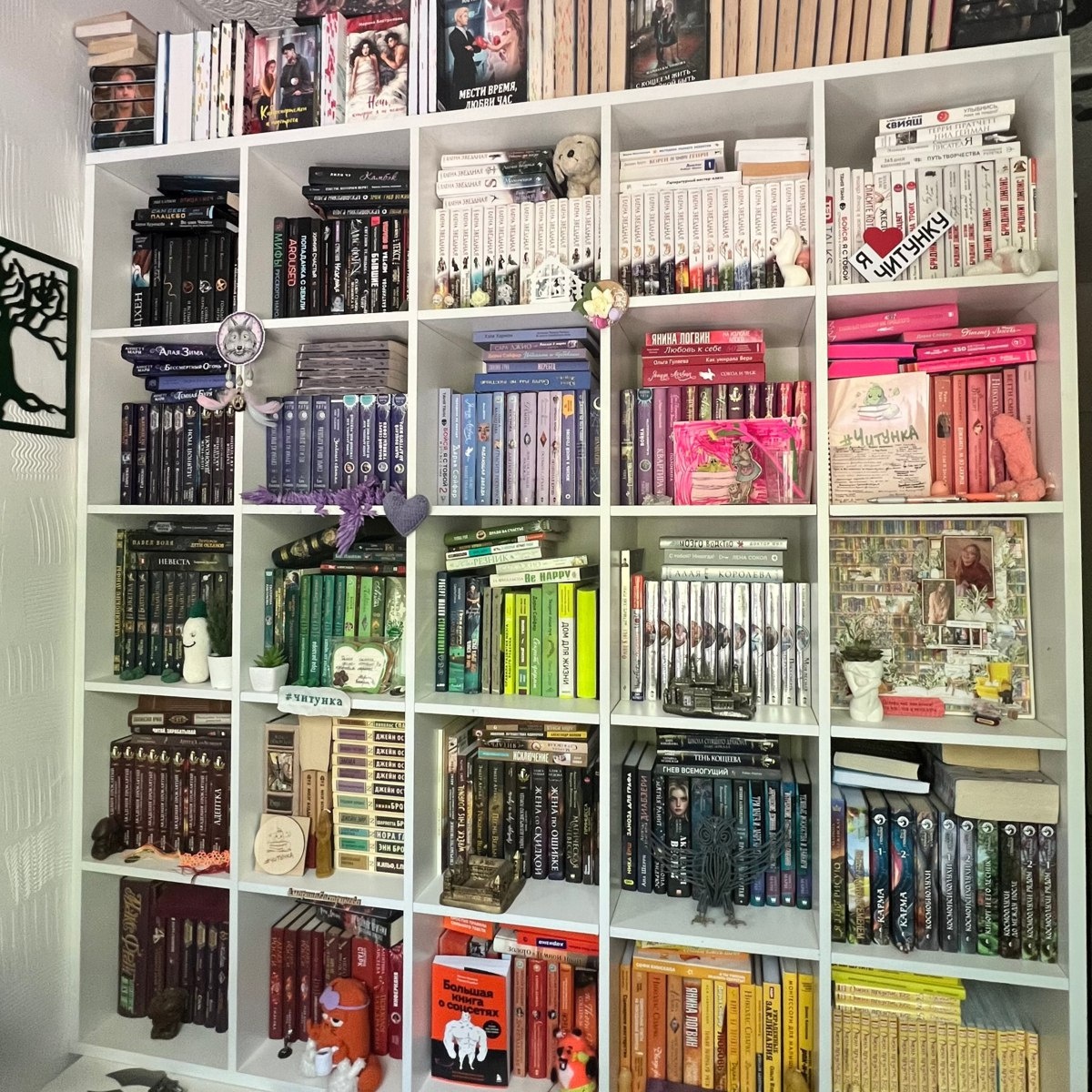 6 часов работы, чтобы перестановка в итоге… не понравилась((( А я ведь цвета все перемешала, чтобы были прочитанные перевернуты. Мол, их корешки видеть мне и не очень-то нужно, а те, что хочу перечитать положила сверху таких полок. Вот вам до, процесс и после.