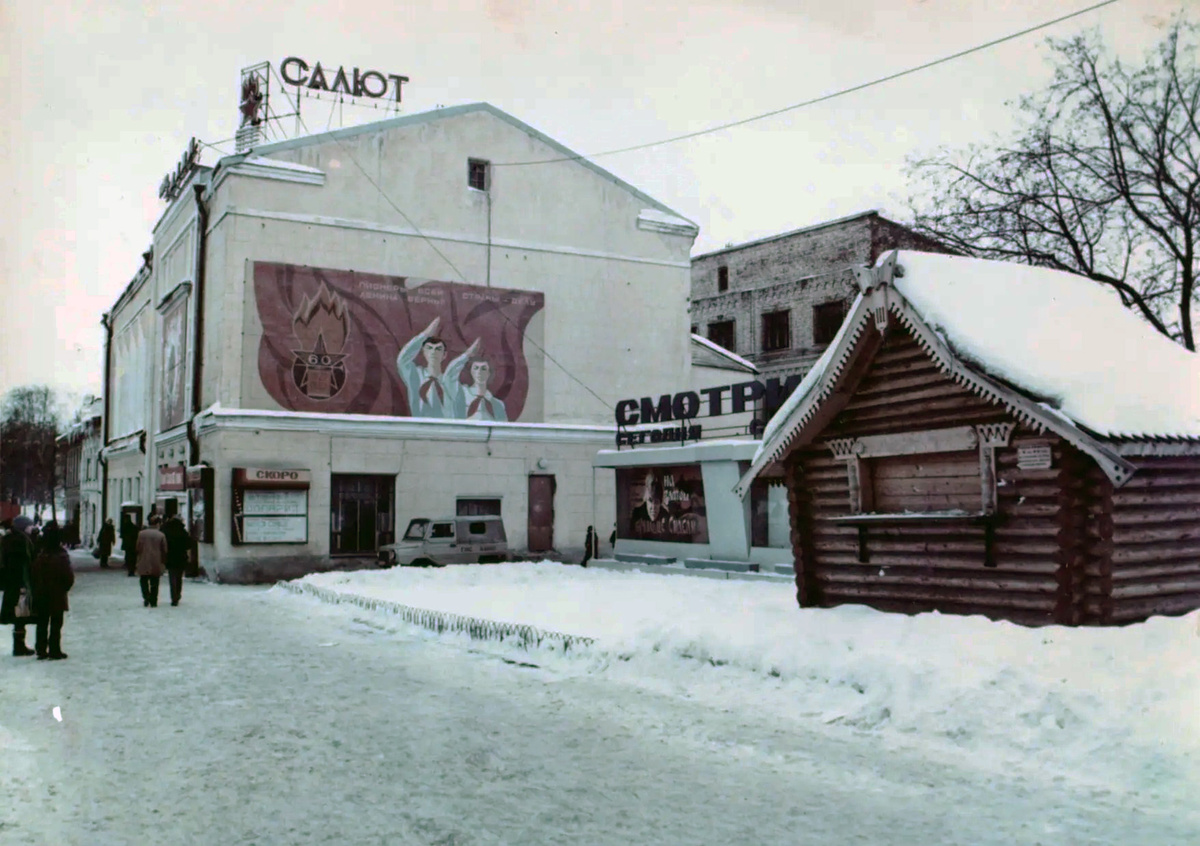 На снимке 1987 года кинотеатр «Салют», в котором тогда 7 дней в неделю устраивали по 8-9 сеансов кинопоказов. Исторически здесь размещался один из первых кинотеатров Вологды под именем «Рекорд».