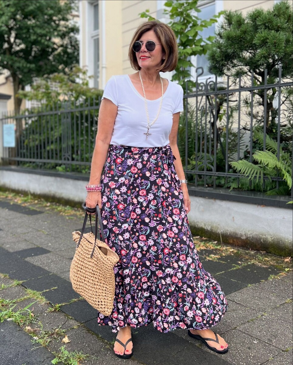 Каждый летний сезон дизайнеры возвращаются к флористическим мотивам, доказывая их неугасающую популярность. От нежных акварельных мотивов до смелых тропических букетов, цветочный принт способен мгновенно преобразить любой наряд! Давайте сегодня рассмотрим 12 удачных идей от блогеров элегантного возраста. Сочетания с базовой белой футболкой вам кажутся скучными? Попробуйте соединить белый «верх» с пестрой цветастой юбкой. Модель длины макси гарантированно не навредит вашему стильному имиджу. Джинсы также будут выглядеть гораздо эффектнее, если дополнить их принтованным жакетом. Босоножки с прозрачными элементами и золотистый клатч привносят в ансамбль изысканную нотку. Женщины в возрасте не отказываются от летящих силуэтов, и правильно делают! Посмотрите на очаровательное комби цветастой майки и юбки-плиссе. Детали: босоножки, вместительный аксессуар. В текущем сезоне не обойтись без платьев с цветочным принтом. Чтобы сделать силуэт более пропорциональным, подчеркните талию с помощью по