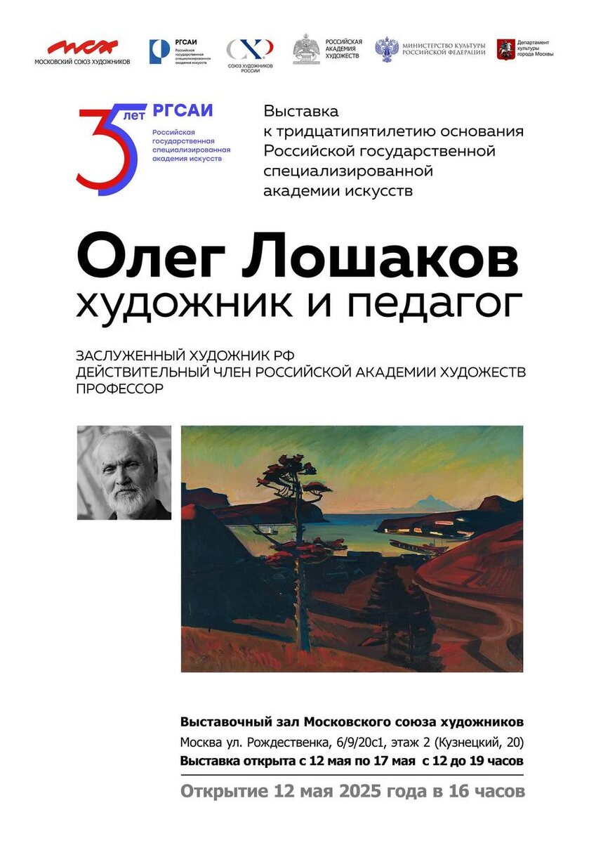 Внимание! Анонс! С 13 по 17 мая в выставочном зале МСХ на Кузнецком мосту 20 пройдёт выставка «Олег Лошаков – художник и педагог» Выставка организована при поддержке Московского союза художников и приурочена к 35-летию Российской Государственной специализированной академии искусств (РГСАИ). На выставке представлены работы мастера и его выпускников.' Олег Лошаков, заслуженный художник РФ, действительный член Российской академии художеств, профессор, основатель «Шикотанской группы художников», ставшей заметным явлением отечественной художественной культуры. Его работы хранятся в Государственной Третьяковской галерее, многих российских музеях и зарубежных собраниях. Педагогический стаж О. Н. Лошакова начинается в 1960 году. Более тридцати лет мастер отдал преподаванию в РГСАИ, возглавлял кафедру живописи и графики.