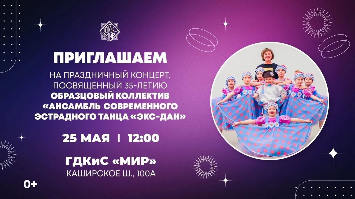 ✨ ✨ Друзья! ✨ С радостью приглашаем вас на потрясающий праздничный концерт, посвященный 35-летию Образцового коллектива «Ансамбль современного эстрадного танца «ЭКС-ДАН»! 🌟 🌌 Только представьте: 35 лет ярких выступлений, вдохновения и неизменной страсти к танцу! Наши талантливые артисты приготовили для вас незабываемый концерт, который не оставит равнодушным ни одного зрителя. Будьте готовы погрузиться в атмосферу невероятной энергии, творчества и танцевального мастерства! 💃🕺 До встречи на празднике танца и эмоций! 🌈 🚫 Возраст: 0+ 📆 25.05.2025🕒12:00 🏢 Дворец культуры и спорта «Мир» 📍 г. Домодедово, Каширское шоссе, д.100А 💰 Вход свободный❗️ ✅ Мероприятия Домодедово https://dzen.ru/id/66f10385cc4c5a16f7b5fb02 http://vk.com/domodedovo_events http://dzen.ru/domodedovo_events
