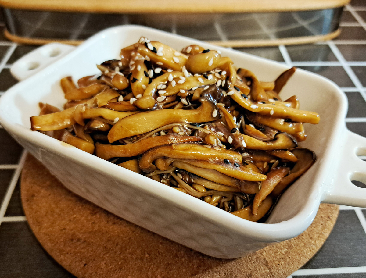 На сковороде слегка обжарить кунжут, добавить соус, он сразу станет загустевать, тогда добавьте грибы, все перемешайте, убавьте до самого минимум и тушите 5 минут.