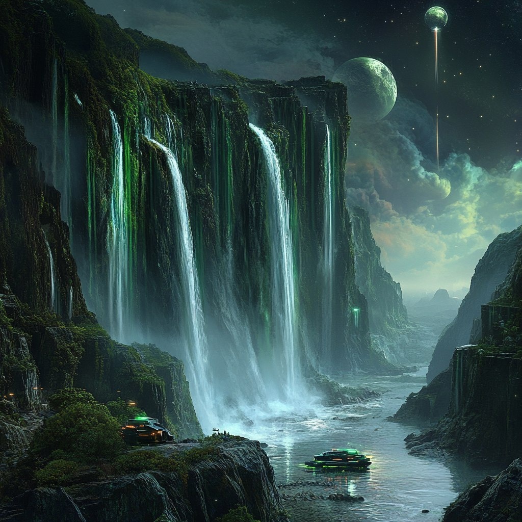 Extraterrestrial planet boasting enormous cascades of translucent emerald fluid plummeting over rugged cliffs, alien wildlife darting between surreal vegetation, a space cruiser docked nearby, the whole scene framed by a pinkish-red nebula.