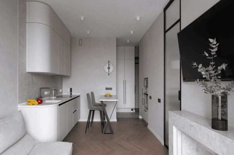 приватной зоны спальни от кухни-гостиной, сохранив простор. Необходимое