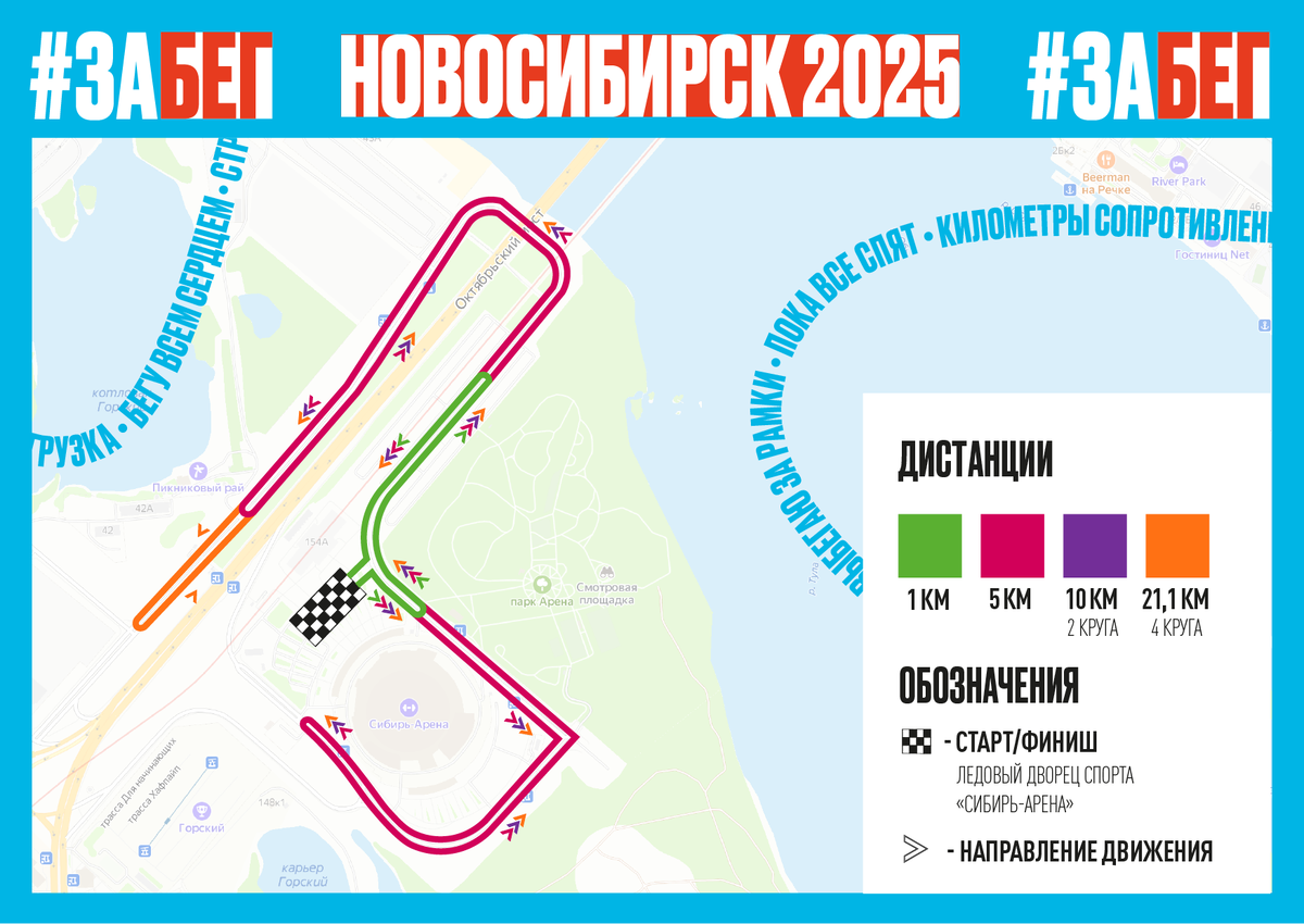 Старт и финиш всех дистанций расположен у ледового дворца спорта "Сибирь-Арена" — одного из крупнейших спортивных объектов Сибири, рядом с зеленой зоной парка "Арена". 1 км — старт в 10:00 Маршрут проходит по дорожке рядом с парком "Арена". Это короткая и приятная дистанция — участники бегут среди деревьев и спортивных площадок, приобщаясь к большому спортивному празднику. Отличный вариант для новичков и самых юных бегунов. ПСБ 5 км — старт в 16:00 Сразу после старта участники огибают «Сибирь-Арену» и пробегают под Октябрьским мостом, откуда открываются виды на Обь и противоположную часть города. Затем маршрут разворачивается вдоль моста и Горского котлована. 10 км (2 круга трассы 5 км) — старт в 11:30 Участники пробегут маршрут дважды, что даст возможность не только насладиться узнаваемыми городскими видами, но и прочувствовать темп. На втором круге появляются тактические вызовы: важно правильно распределить силы. 21 км (4 круга трассы 5 км) — старт в 13:00 Полумарафонская дистанция п