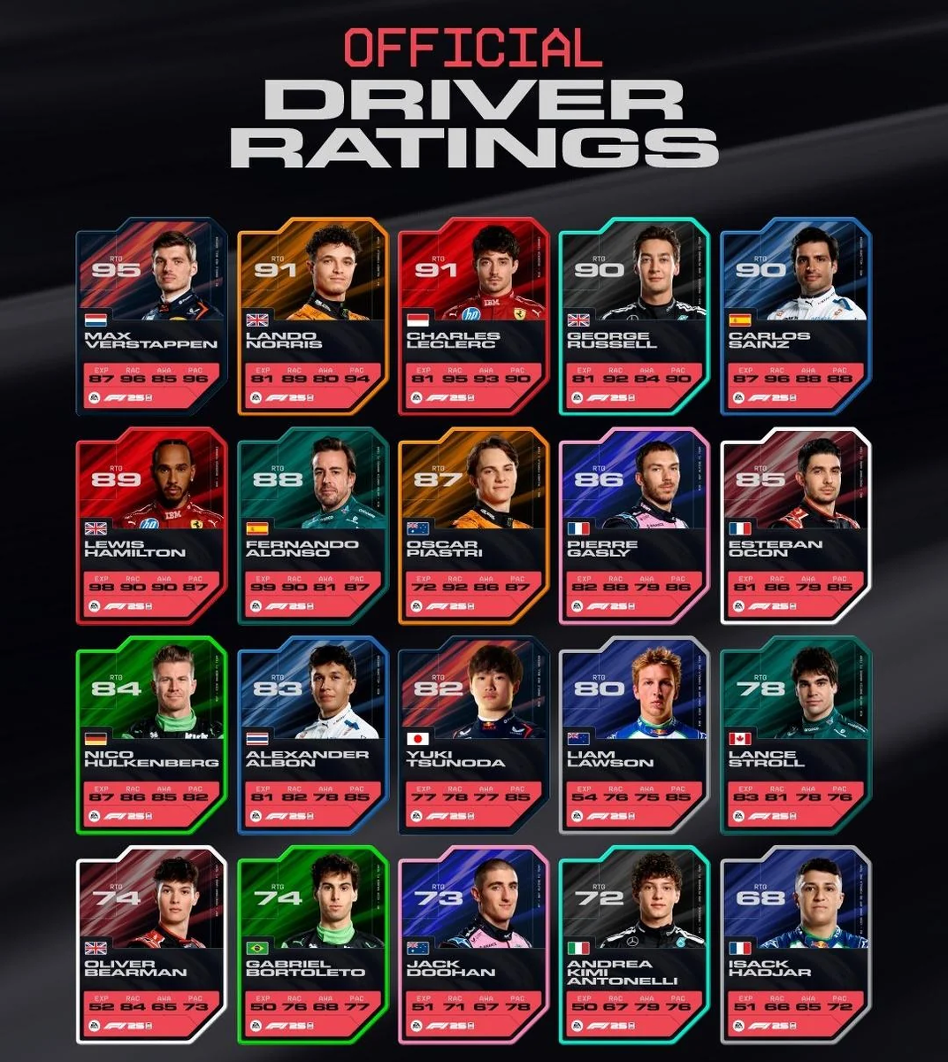 За несколько недель до релиза издатель опубликовал рейтинги всех пилотов главной серии. Самый высокий предсказуемо получил действующий чемпион мира Макс Ферстаппен – 95, а самый низкий − новичок «Рейсинг Буллз» Изак Аджар – 68.