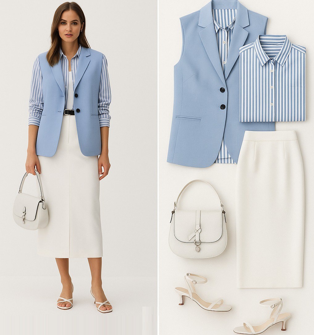 ✨ Современный лук с ноткой элегантности💼🌸👠 🔗 Ссылки на вещи: 👚 Голубой жилет без рукавов – лёгкий, но структурированный элемент, добавляющий образу строгости и стиля. Универсальная вещь для деловых встреч и прогулок по городу. 👕 Рубашка в голубую полоску – классика с изюминкой. Освежающий принт и прямой крой создают ощущение лёгкости и свободы. 👗 Белая миди-юбка – утончённый силуэт и длина делают образ женственным и современным. Прекрасно сочетается с ярким верхом. 👜 Сумка – элегантная и вместительная. Добавляет образу утончённости и завершённости. 👡 Белые босоножки на каблуке – минимализм и комфорт в одном флаконе. 💵 Стоимость образа ≈ 15 000 ₽ #элегантныйлук_looksmania #капсульныйгардероб_looksmania #деловойстиль_looksmania #стилькаждыйдень_looksmania #мидиюбка_looksmania #минимализм_looksmania