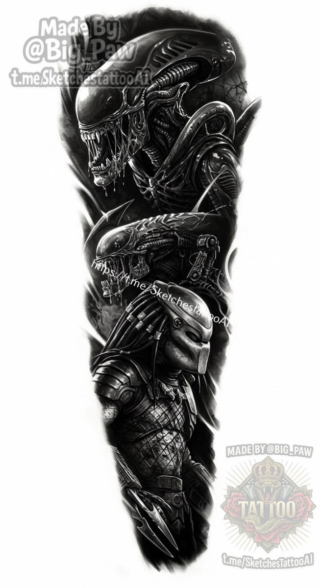 #2390 Подборка по запросу подписчика - подборку на рукав в стиле Чужой против Хищника 🧠 SYNTX 💳 Донат 😎 НейроБро 😎 Эскизы без вотера 💀 Эскизы от нейросети #хищник #чужой #рукав #эскизы #тату #татуировки