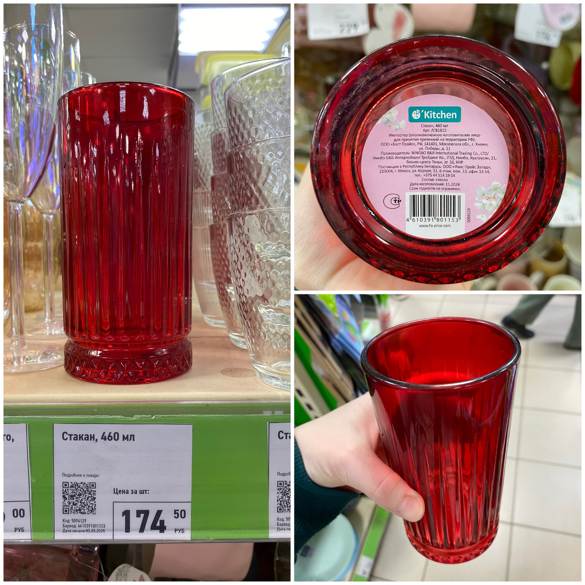 Стакан стоимостью 174 рубля 50 копеек. Его объём 460 мл. Состав: стекло. Страна изготовления Китай.