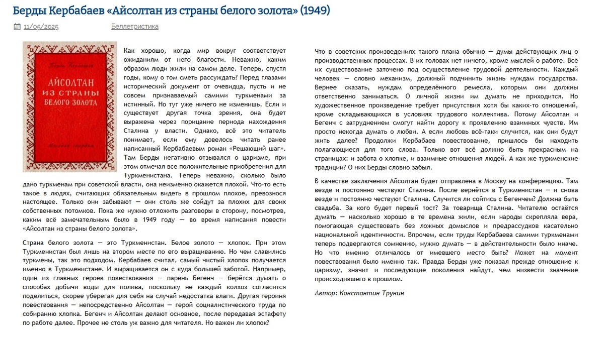 Берды Кербабаев «Айсолтан из страны белого золота» Критика