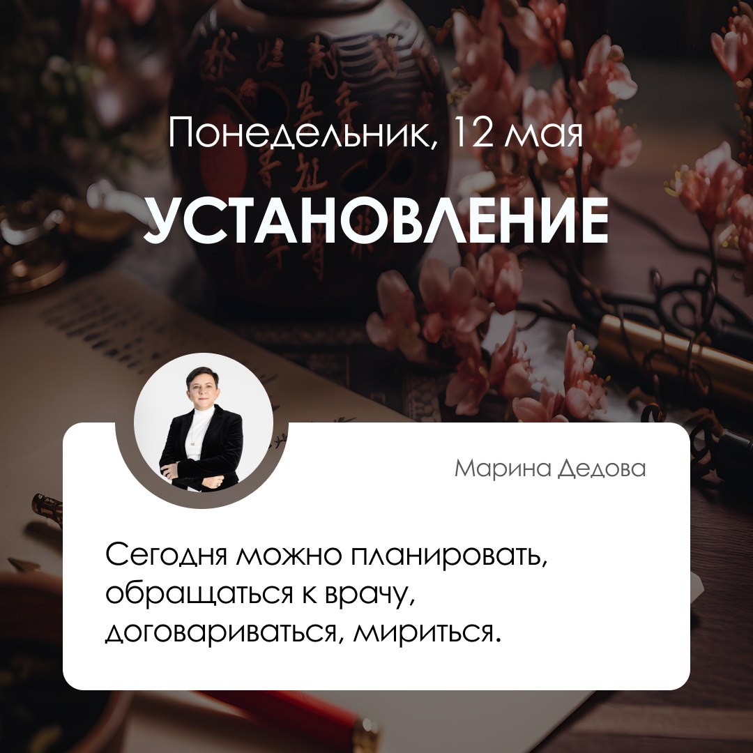 ✅ Прогноз на 12 мая, понедельник Установление День подходит для дел средней важности. Можно планировать, обращаться к врачу, договариваться, налаживать отношения, мириться. Не стоит начинать новые проекты и ремонт, играть свадьбы. В дне присутствует сразу три Змеи, поэтому более внимательными и осторожными стоит быть людям, рожденным в год Свиньи, особенно с 21 до 23 часов. Лучшие часы: Бык (01-03), Тигр (03-05), Лошадь (11-13), Собака (19-21) Худшие часы: Петух (17-19), Свинья (21-23) Пустые часы: Обезьяна (15-17), Петух (17-19) *Прогноз дня указывает общие тенденции. Для важных событий даты лучше выбирать индивидуально. Лучшие часы – хорошее время для многих дел. Худшие часы – не подходят для большинства начинаний. Пустые часы – достаточно бесполезное время для важных дел.