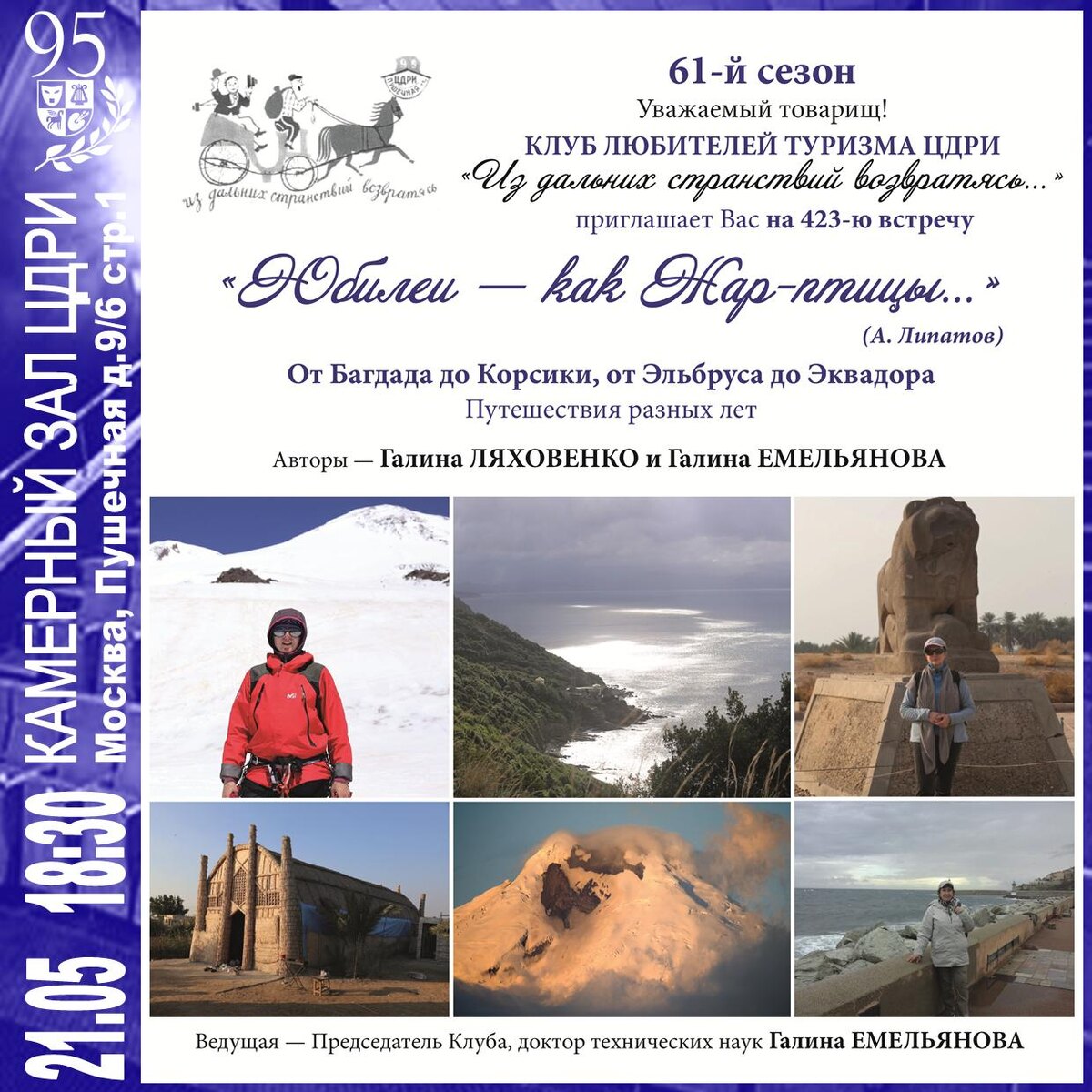 приглашает на 423-ю встречу От Багдада до Корсики, от Эльбруса до Эквадора Путешествия разных лет Авторы — Галина Ляховенко и Галина Емельянова Ведущая — Председатель Клуба, доктор технических наук Галина ЕМЕЛЬЯНОВА Билеты на сайте: https://cdri.ru/afisha/maj-2025/turisty_21-maya.html
