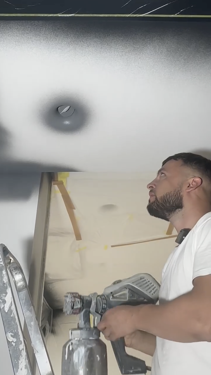 Разбираем по шагам, как выполняется качественная покраска безвоздушным способом — от обеспыливания до финального слоя. Если вы хотите добиться по-настоящему качественной безвоздушной покраски, то тут не обойтись без внимательной подготовки. Многие думают: “Купил аппарат — и вперёд!” Но настоящая работа начинается задолго до включения распылителя. Делюсь пошаговым процессом, как мы делаем безвоздушную покраску на объектах. Перед тем как приступить к покраске, важно пройти все этапы подготовки поверхности: Обклеиваем всё, что не должно быть покрашено: Важно затемнить окна или зону окраски. Почему? Потому что работаем под прожектора, чтобы видеть где покрашено, а где нет. Кто-то использует Scangrip или прожектор, мы большинство красим под лампу Лосева! После обеспыливания наносим глубоко проникающую грунтовку (ГГП). Чаще всего применяем Тифенгрунд Затем идёт слой грунт-краски — у большинства производителей она есть в линейке. Но в реальности не всегда используем строго по инструкции —