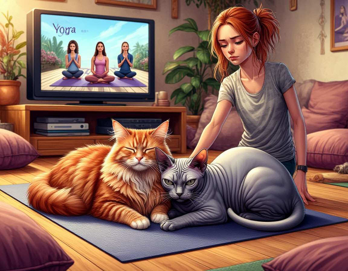 Хозяйка внезапно решила, что в этом доме всем не хватает духовной гармонии. Нет, вы не подумайте, никто не драл обои (ну, почти), просто она купила коврик, включила на телевизоре "ЙОГА С УТРА ДО ВЕЧЕРА", и с первого же «вдох-выдох» начала скрипеть суставами, как старый табурет. Грета наблюдала за этим с подоконника, не моргая. Сначала она подумала, что хозяйка сошла с ума и решила умереть в странной позе. Но потом стало интересно. — Что она делает? — спросил Гектор, лениво выползая из-под пледа. — Похоже, что-то между охотой на невидимого голубя и попыткой облизать себе лопатки, — задумчиво сказала Грета. — Это что, новая игра? Гектор был энтузиаст. Он считал, что если что-то двигается, туда надо прыгнуть. А если не двигается — тоже прыгнуть, а вдруг начнёт?