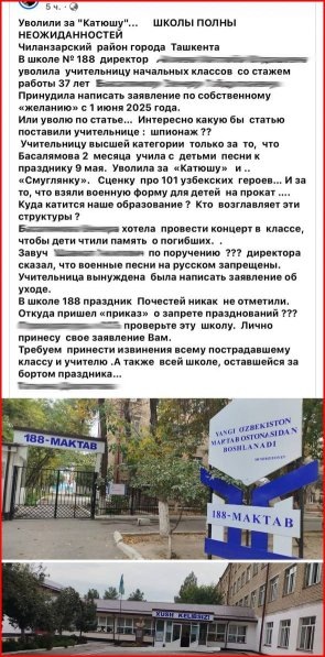 В социальных сетях появилась информация о том, что директор одной из школ Чиланзарского района уволил педагога за инициативу разучивания с учениками песен «Катюша» и «Смуглянка», а также о том, что в школе не проводились мероприятия ко Дню памяти и почестей. Ситуацию прокомментировала пресс-служба Управления дошкольного и школьного образования города Ташкента.