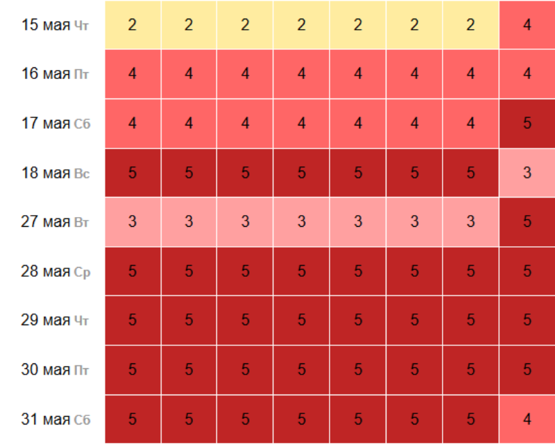 Согласно прогнозам, с 15 мая начнется период умеренных магнитных бурь силой в 4 балла. Пик геомагнитной активности придется на 17-18 мая, а также на период с 27 по 31 мая, когда сила бурь достигнет 5 баллов. Несмотря на то, что эти бури классифицируются как умеренные, многие волжане могут ощутить их влияние. Скриншот с сайта my-calend