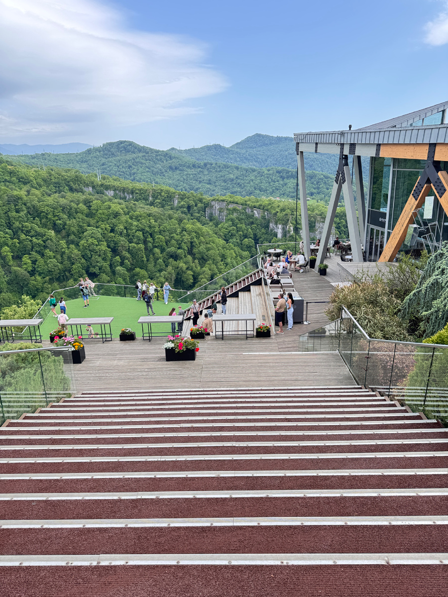 Фото: Южанка о Краснодаре недвижимости и отдыхе В Сочи была много раз и посетила Сириус с Олимпийским парком, Сочи парк с аттракционами, Красную Поляну, Розу Хутор. Скайпарк для меня новое. Сначала остановилась на смотровой площадке рядом с кафе. Оттуда открываются очень красивый панорамный вид. В сам ресторан не удалось попасть, он был выкуплен. Это первое самое большое разочарование. Но потом все-таки нашла пиццериею в горах, про это позже. Вам проводят инструктаж, одевают в экипировку, затягивают ремни покрепче...А вы расправляете руки и прыгаете головой вниз. Можно летать в тандеме и самостоятельно. Очень популярно, судя по очередям. Постарались быстрее уйти, все и так ясно - очередь мы видели, прыгающие вниз головой со страховкой - зрелище скучное. Это самый длинный подвесной пешеходный мост в России. Он располагается на высоте 230 метров –выше 70-этажного здания. Пейзажи впечатляют – вокруг горы, внизу бирюзовая река и густой лес. Река течет вдоль трассы...Можно споко