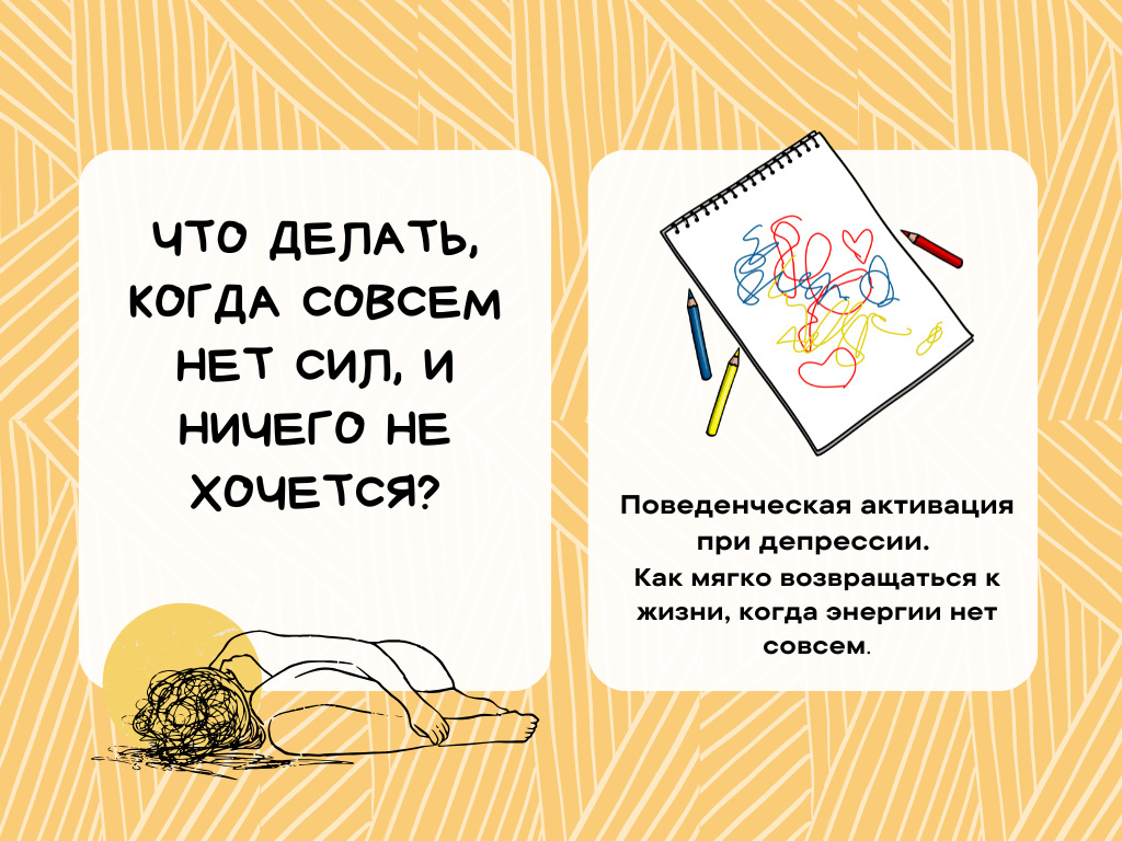 Что делать, когда совсем нет сил, и ничего не хочется. Поведенческая активация при депрессии, как мягко возвращаться к жизни, когда энергии нет совсем. Иногда дело не в тревоге. Иногда ты всё понимаешь, но просто не хочешь ничего. Не встаёшь. Не выходишь. Не отвечаешь. Не потому что не надо, а потому что не можешь. 📌 И это не лень. Это не слабость. Это - состояние безнадежности и апатии. Оно может называться депрессивным эпизодом, эмоциональным выгоранием, упадком сил, внутренней пустотой. И в такие моменты любые фразы вроде: соберись, начни с малого, просто заставь себя, возьми и сделай - звучит как издёвка.