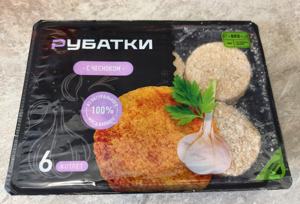 Всем привет! Сегодня на обзоре, наверное, самые дешёвые котлеты, которые мне удалось найти. Котлеты Рубатки с чесноком. Шесть котлет обошлись мне в 83 рубля. Даже в самой дешёвой столовой одна котлета стоит дороже. Котлеты из 100% мяса курицы без ГМО и глутамата натрия. Сразу становится интересно как можно сделать котлеты из курицы по цене в два раза дешевле самой курицы? Изготовитель: ООО "Котлетарь", гб Кострома. В составе котлет мясо куриное, вода, лук репчатый, мука соевая, соевый белок, чеснок, волокно растительное, сухари панировочные. И здесь уже начинает становиться понятно, почему котлеты так дёшево стоят. Наиболее вероятно, что соевой муки и растительного волокна в них больше, чем курицы. Могли бы перца черного или каких-нибудь специй добавить для вкуса. В лотке шесть аккуратных запанированных котлет. Обжариваю в масле до готовности, стараясь следить чтобы котлеты не сгорели. Они держат форму и жарятся хорошо. По структуре котлеты непонятные. Но это точно не рублен