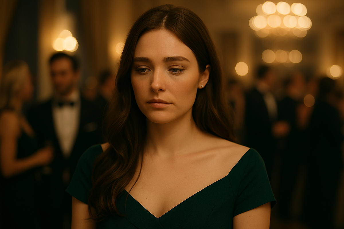 Музыка звучала громко, но разговоры стихли — воздух наполнился напряжением. Люстры отбрасывали мягкий свет, отражаясь в бокалах шампанского. Официанты замерли, а гости переглядывались, гадая, что будет дальше. У дверей появилась Лера — его законная жена. Её изумрудное платье подчёркивало изящество фигуры, а в глазах сверкали решимость и холод. В воздухе повисла электрическая тишина.