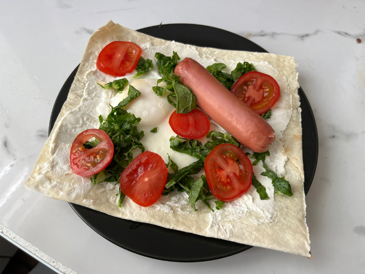 Понравился нам завтрак в лаваше. Сытно, вкусно, разнообразно. На этот раз лаваш, творожный сыр, яйцо на пару, свежие помидоры, зелень, сосиска с максимально хорошим составом.