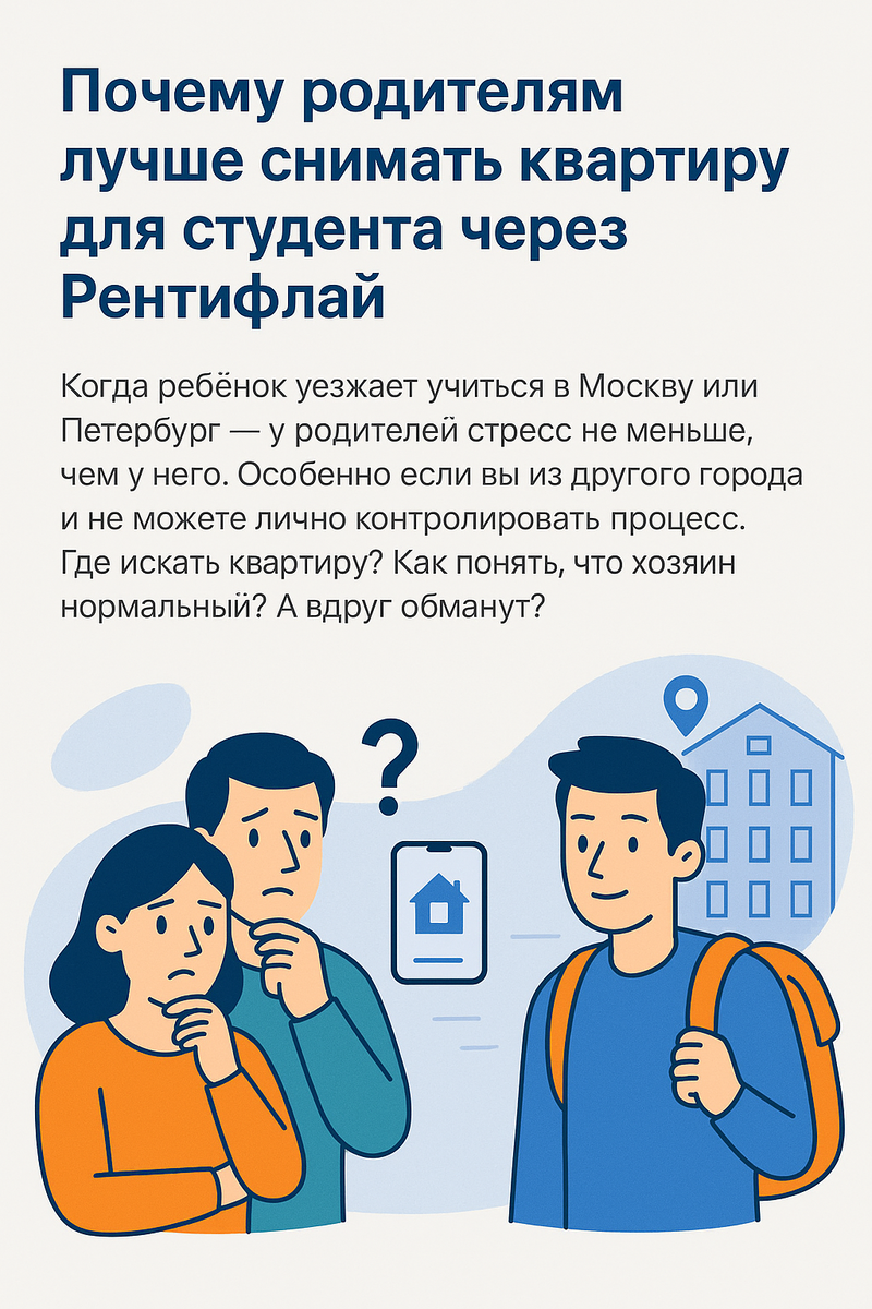 Самый распространенный - приехать в город вместе с ним выбрать на доске объявлении квартиру, приехать вместе с ребенком и убедившись, что все хорошо подписать договор. И уехать домой. И в большинстве случае все и правда будет хорошо (ну не люблю я зря пугать людей)! Но в некотороых случаях могут возникнуть незначительные но неприятные проблемы, что бы их решить надо либо самому возвращаться назад либо нервотрепка по телефону и т.д. В особо запущенных случаях может попасться "Бабка собственница обыкновенная" которая своим долгом будет считать не то что проверять квартиру раз в три дня, но и портить жизнь разными другими способами. Но самое главное, что надо самим ехать, выбирать, смотреть, подписывать и т.д. Мы в Rentifly как то даже не задумывались над такими клиентами. И когда к нам стали обращаться родители с просьбой заселить их чадо - были приятно удивлены. Данный тип арендатора - сплошные плюсы. Во первых договор заключается на родителя - платит родитель. Он же в случае чего и отв