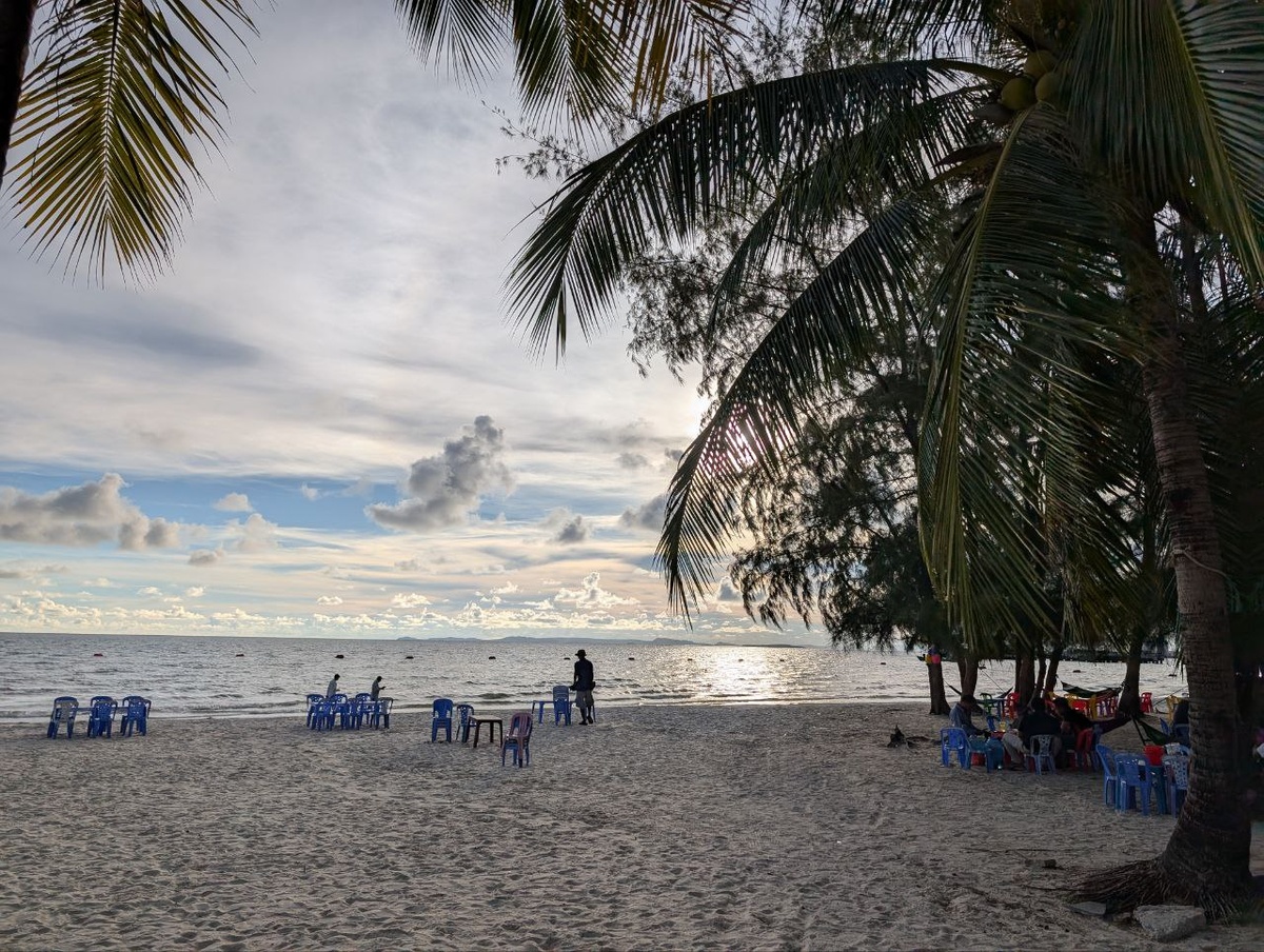 Есть такие вечера, когда ты не просто отдыхаешь, а после которых ты оживаешь. Вечер на пляже Отрес был именно таким. И раз уж мы не поехали на один из островов, надо провести высвободившееся время с максимальной пользой. Благодатный опыт лицезрения заката с корабля на Меконге вдохновил и требовал повторения и закрепления. И оно случилось. Вечернее побережье встретило легким ветерком, солоноватым и почти невесомым. Вот так дышит море. Волны уютно шуршали, лениво разбиваясь о берег, и этот ласковый прибой звучал как колыбельная, написанная для души. Мы не спеша и с удовольствием шли по берегу, даже не пытаясь догнать заходившее за морской горизонт солнце. Да и оно не торопилось, стараясь подольше понежиться в теплой морской ванне с пеной. Оно опускалось медленно, с достоинством, окрашивая Сиамский залив в невероятные цвета — от нежного персика до насыщенного золота, от бронзы до фиолетовых теней. Это было не просто красиво — это было неземное, почти райское зрелище, в котором хотелось р