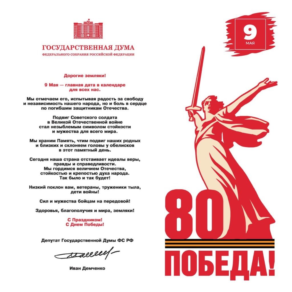 Дорогие земляки! Поздравляю с 80-летием Победы Советского народа в Великой Отечественной войне. День Победы 9 Мая – главная дата в календаре для всех нас. Мы отмечаем его с радостью за свободу и независимость нашей Родины и с болью в сердце о погибших защитниках Отечества. Подвиг Советского солдата в Великой Отечественной войне стал незыблемым символом стойкости […]
