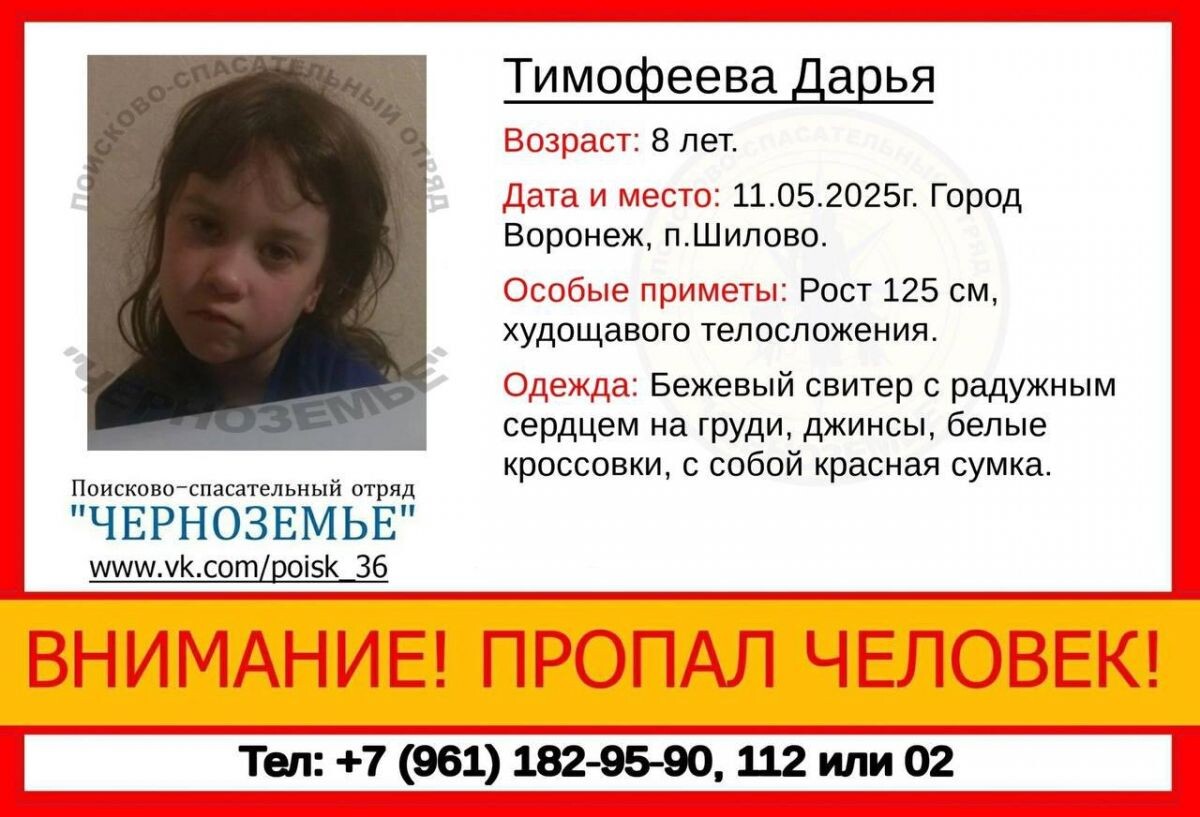 В Воронежском микрорайоне Шилово пропала 8-летняя Даша Тимофеева. Она ушла из дома сегодня, 11 мая, около 7 часов утра, и до сих пор не вернулась домой. Ориентировку распространили волонтеры поисково-спасательного отряда "Черноземье".