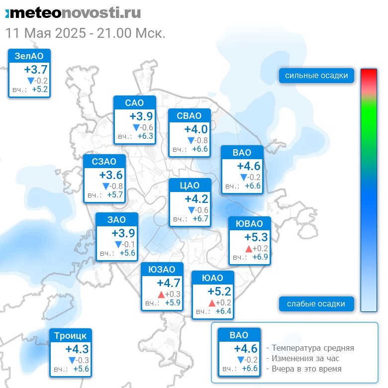 В 21:00 в Москве было от +2.6°C до +5.6°C, средняя температура +4.4°C #погода #Москва #весна #температура #11мая #воскресенье Перейти на сайт Прогноз погоды на 14 дней