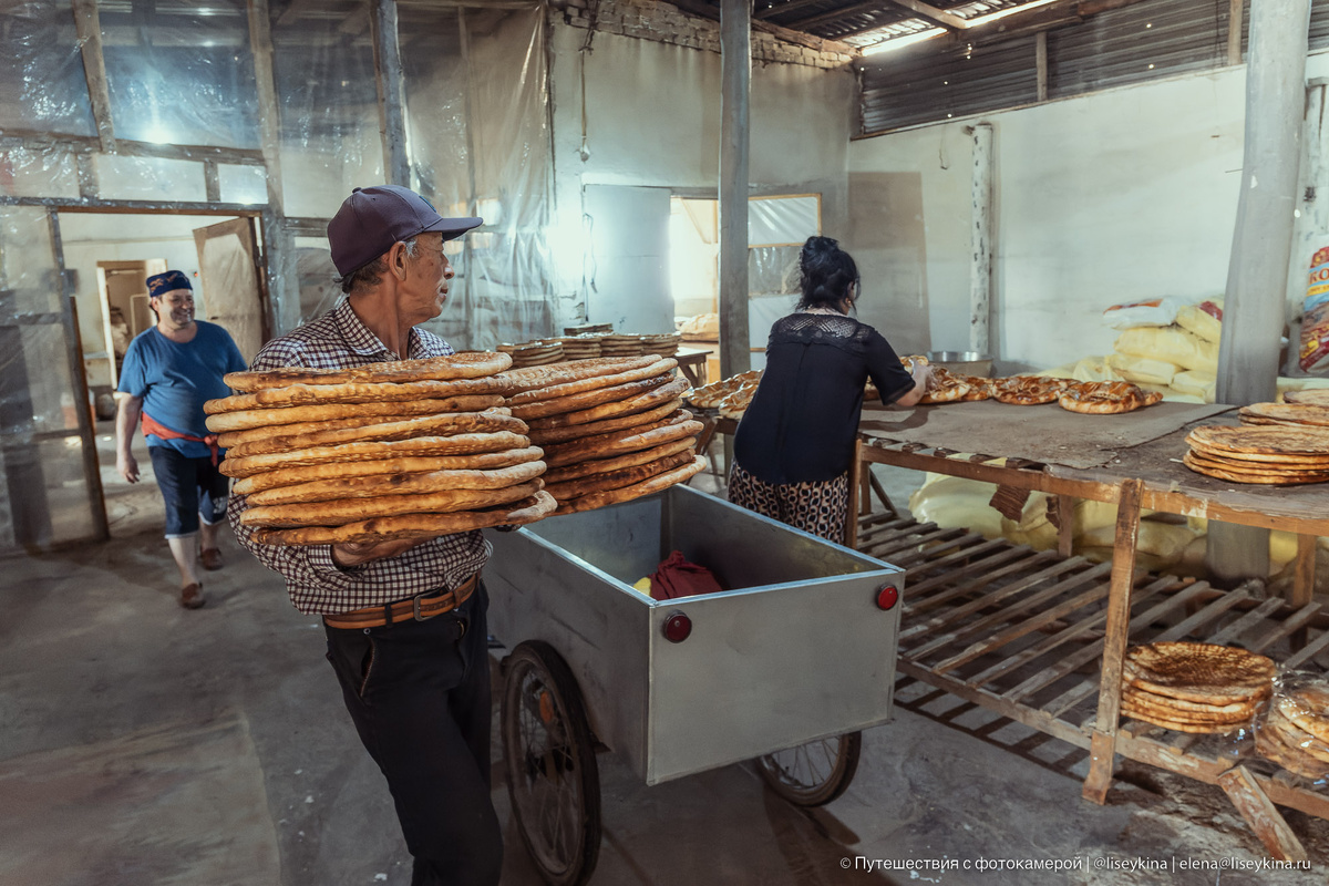 Узбекские лепёшки пекут в тандырах прямо на улицах (ну и в пекарнях тоже). Но к хлебу тут особое отношение. Его нельзя класть лицом вниз, резать ножом, нельзя выбрасывать, откусывают его перед дорогой «на удачу». Предложили лепёшку — берите.