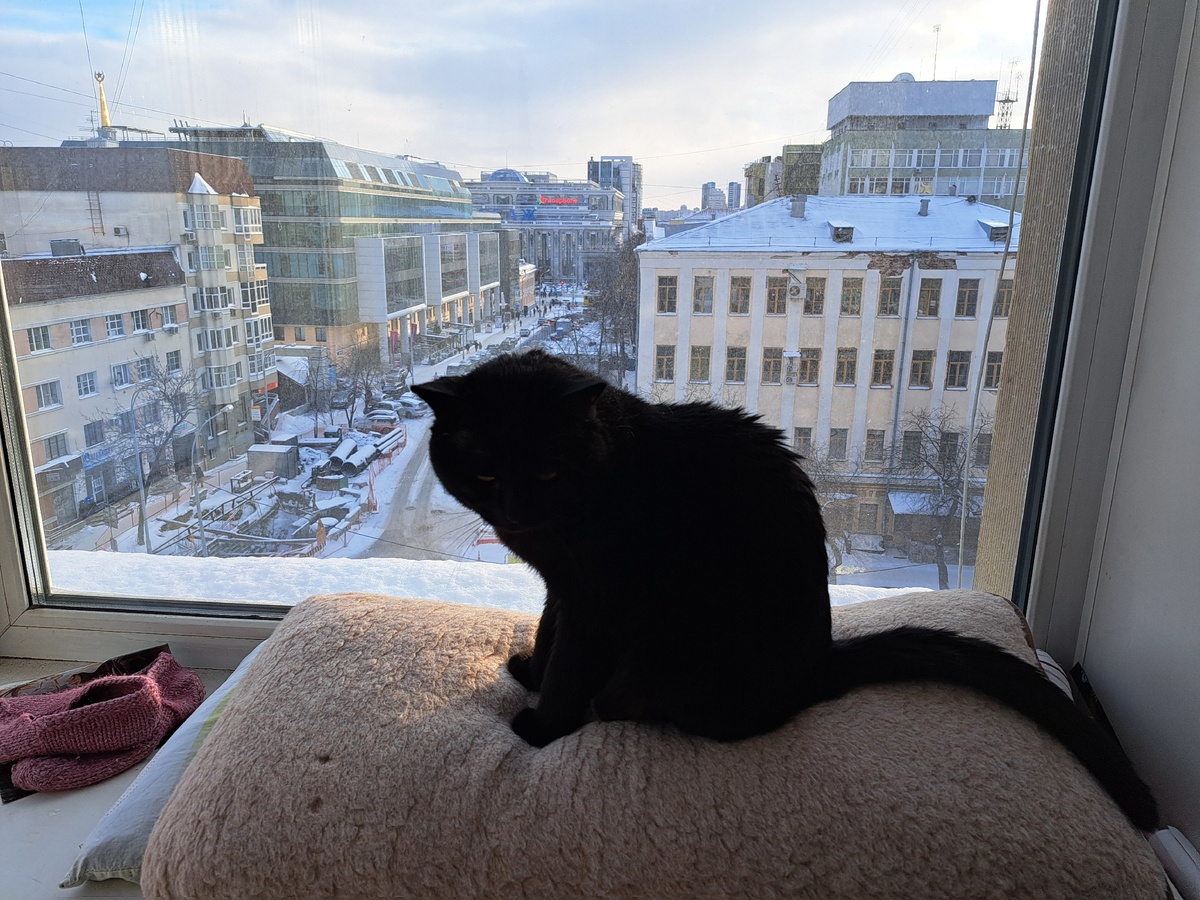 Начало мая, а за окном снег, Рано обрадовались весне. А ведь только на днях было +24, довольные уральцы одели футболки и летнюю обувь. Однако, через 2 дня вечером пошел густой снег. Он шел с переменным успехом, днем слегка подтаивал и снова шел. А это последнее фото уже нашего Василия. Он прожил у нас всего 3 месяца, его принесли уже 6-летним, крупного черного красавца уже со своим характером и привычками. По утрам он громко требовал выпустить его за окно, чтобы побродить по металлическому наружному подоконнику и посмотреть , что делается внизу. Однажды не удержался, упал на 2 этажа ниже на балкон,ударился о перила похоже, т.к. диагностировали перелом ребер с повреждением легких. Хозяин балкона искал владельцев кота, а мы в это время, не увидев его на балконе, бегали по пристроенным магазинам, чтобы искать его на крыше пристроя. Тогда он отвез его в ближайшую ветклинику, где его поместили в реанимацию. Я приехала с ним на другой день, чтобы переоформить договор лечения. Клиника отлич