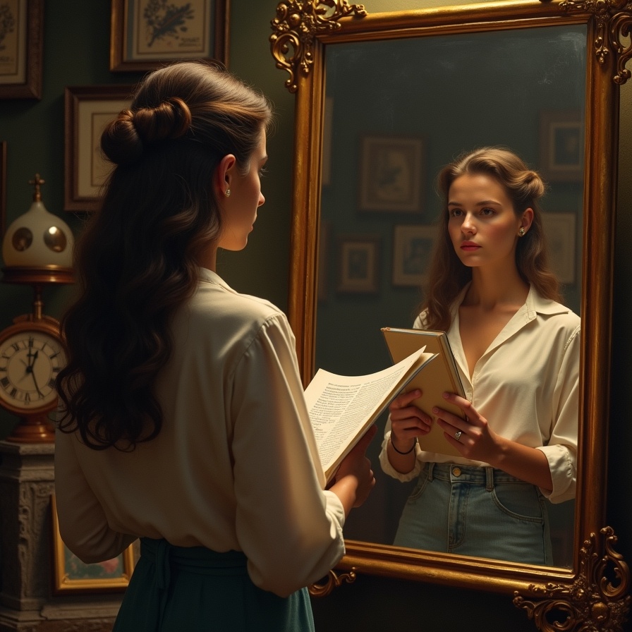 Лиза, немного смущенно, встала напротив зеркала. Её отражение — юное, прекрасное, полное жизни — словно засветилось изнутри.