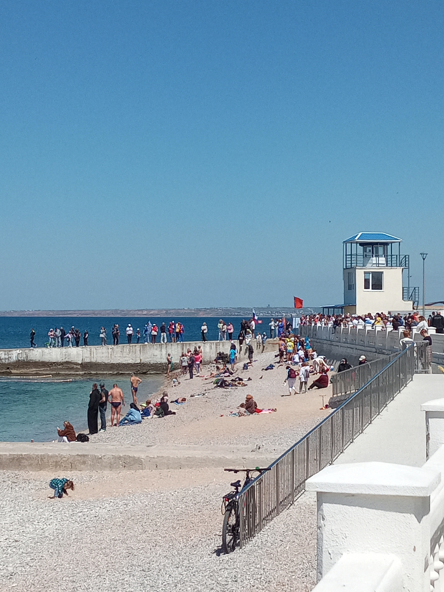 Обещала показать море в мае и туристов Севастополя. Вот они наши граждане, никуда не делись. Особенно много старшего поколения прибыло. Группами и семьями. И загорают, и даже плавают. Сибиряки, видимо, заплывают, кто ещё? Очень чистое море, никакого мазута нет. Ощущаю себя очень защищённой. Наше ПВО нас бережет... А город все краше...
