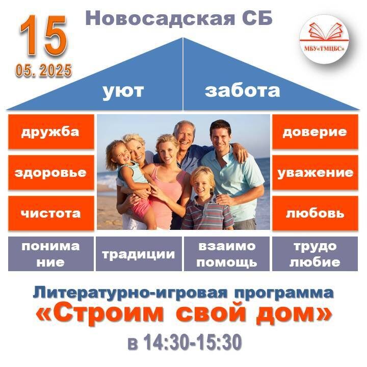 Приглашаем всех желающих на литературно-игровую программу «Строим свой дом», которая состоится 15 мая 2025 года с 14:30 до 15:30 в Новосадской библиотеке. В рамках празднования Международного Дня семьи мы поговорим о самом важном — о семье, являющейся источником любви, уважения и взаимопонимания. Сотрудник библиотеки подготовит для детей множество интересных активностей, в ходе которых ребята смогут: - Познать смысл и ценность семьи как основного кирпичика общества. - Построить свой счастливый семейный дом, используя карточки со словами для моделирования идеальной семьи. - Принять участие в конкурсах и играх, способствующих сплочению и взаимовыручке: «Народная мудрость гласит», «Паровозик», «Ворчалки». Также детям будут предложены книги о семейных ценностях и значении семьи в жизни человека. Не пропустите возможность провести этот особенный день с пользой и радостью! Ждем вас в библиотеке!